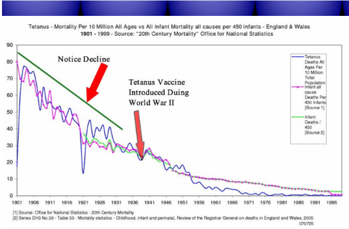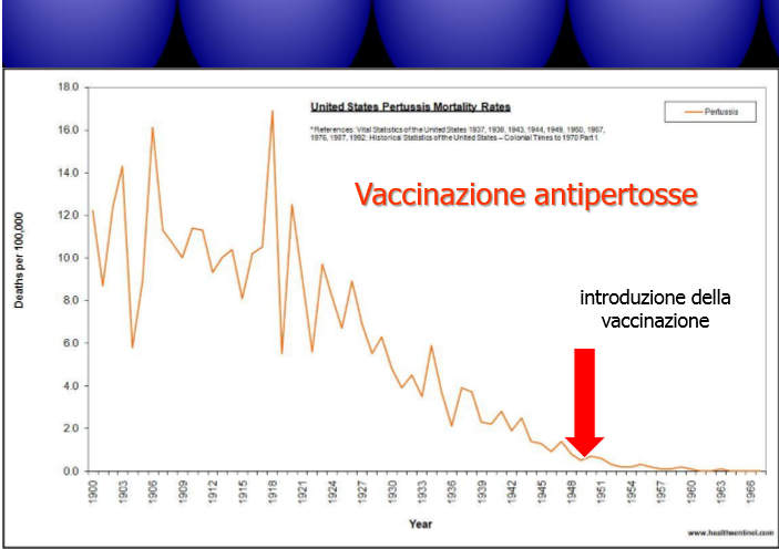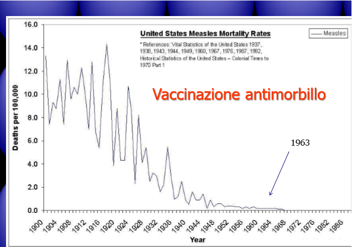 - Da grafici statistici sulla mortalità per certe malattie per cui ora ci si vaccina si evince che i vaccini non hanno fatto alcun effetto e quindi non hanno salvato milioni di persone come alcuni affermano. Infatti se fosse stato cosi l’andamento del grafico dopo l’introduzione dei vaccini avrebbe dovuto subire una brusca discesa ma le cose non stanno cosi e il grafico continua in una normale discesa come già stava facendo.
