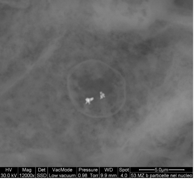 Se il glifosato è un inquinante che può essere presente nei vaccini, ciò che inquina apparentemente in ogni caso quei prodotti sono le micro- e nanoparticelle solide e inorganiche. Negli ultimi 15 anni il nostro laboratorio (Nanodiagnostics di Modena) ha analizzato 33 vaccini diversi di cui 32 per uso umano e uno per uso veterinario. Se il Feligen (vaccino trivalente per i gatti) ha mostrato di essere esente da quell’inquinamento, non così per i 32 tipi destinati all’uso umano. In ogni caso quei prodotti hanno mostrato di contenere particelle composte principalmente da metalli pesanti (ma anche non metalli come il silicio o il calcio). La composizione delle particelle si è mostrata piuttosto varia con una certa prevalenza di leghe di ferro, cromo e nichel (acciaio inox) e tungsteno. Ma non pochi altri elementi sono stati trovati: piombo, titanio, bismuto, zinco, bario, rame, magnesio, fosforo, zolfo…) Occorre precisare che la tossicità di quelle particelle è solo in parte legata agli elementi che contengono. La loro aggressività è dovuta al fatto di essere corpi estranei e come tali essere percepite. Questo innesca le note reazioni consistenti nell’instaurazione di una forma infiammatoria a carico del tessuto che le ospita e nella formazione di un tessuto di granulazione che le avvolge isolandole dal resto dell’organo. Questo tessuto resta cronicamente infiammato essendo l’innesco, cioè la particella, non degradabile ed è potenziale inizio di uno stato canceroso. Ma quelle particelle hanno pure la capacità di attrarre le proteine del sangue formando la cosiddetta corona proteica. Il quel caso la proteina viene alterata soprattutto dal punto di vista sterico e non è più riconosciuta dall’organismo se non come potenziale nemico. Da qui le numerose forme di malattie autoimmuni. Una caratteristica ulteriore delle particelle è quella di passare con estrema facilità da madre a feto andando a provocare una serie di condizioni patologiche. Per questo, somministrare vaccini alle donne gravide comporta un rischio tutt’altro che trascurabile. Ancora, le particelle entrano spontaneamente all’interno del nucleo delle cellule interferendo negativamente con il DNA (vedi nostra foto di cellula al microscopio ESEM e di DNA in via di replicazione al microscopio TEM) ed esitando in risultati imprevedibili.
